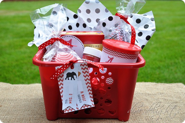 I put Honey’s extensive sports knowledge to the test by quizzing him on Alabama’s colors, mascot and logo and then pulled together everything Mrs. B will need to bake cupcakes for her team this football season. I lucked out with some serious sales and the grand total for the gift rang up to under eight dollars. The sprinkles and cupcake liners are from Michael’s and the basket is from Dollar Tree.